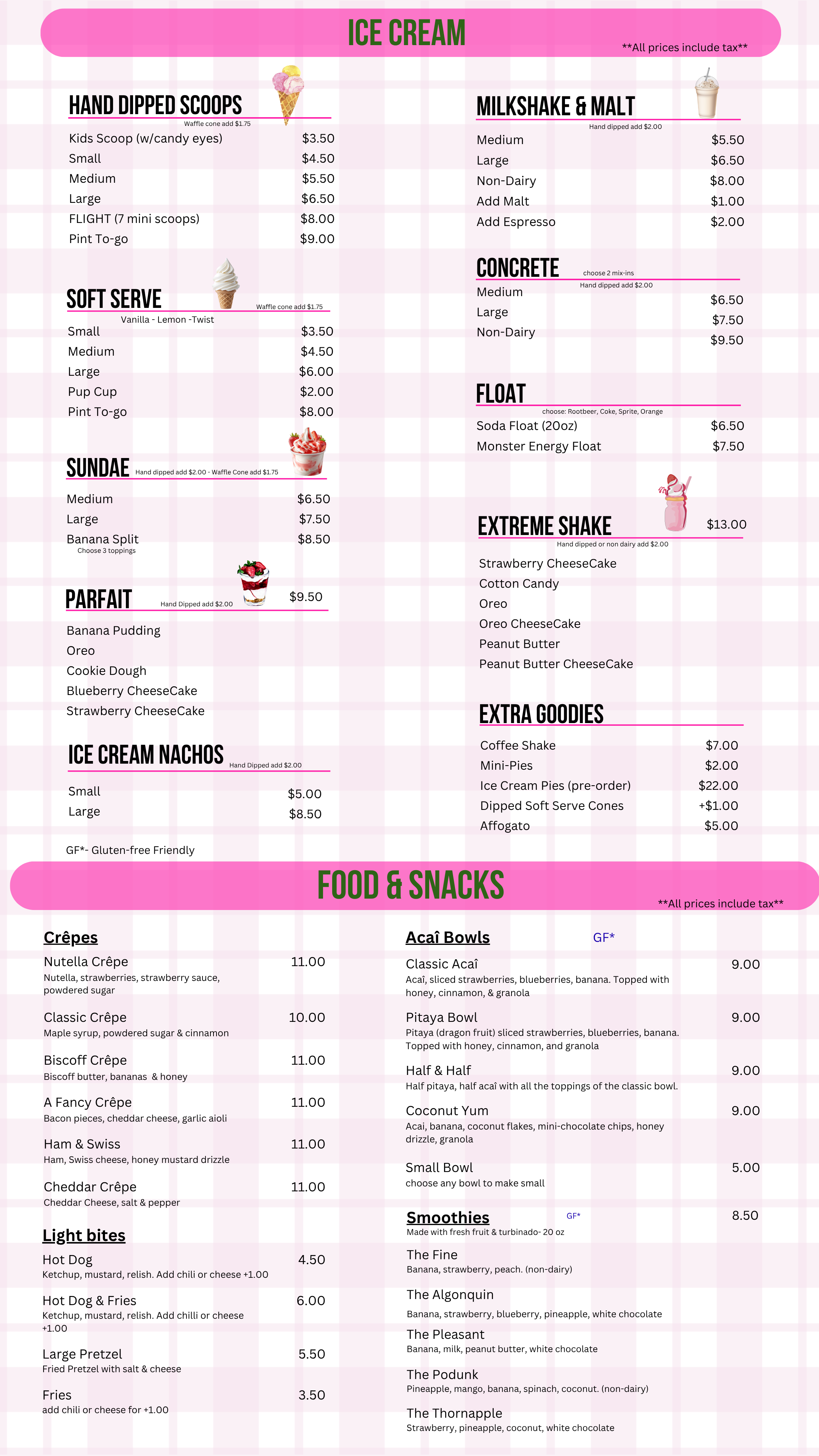 Creamy Vanilla or Lemon soft serve, Mooville & Ashby’s hand dipped ice cream, loaded extreme shakes, Sundaes, Ice cream nachos, Acai, Crepes, Iced Lattes, Non-dairy & GF friendly options…